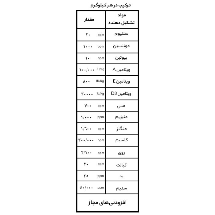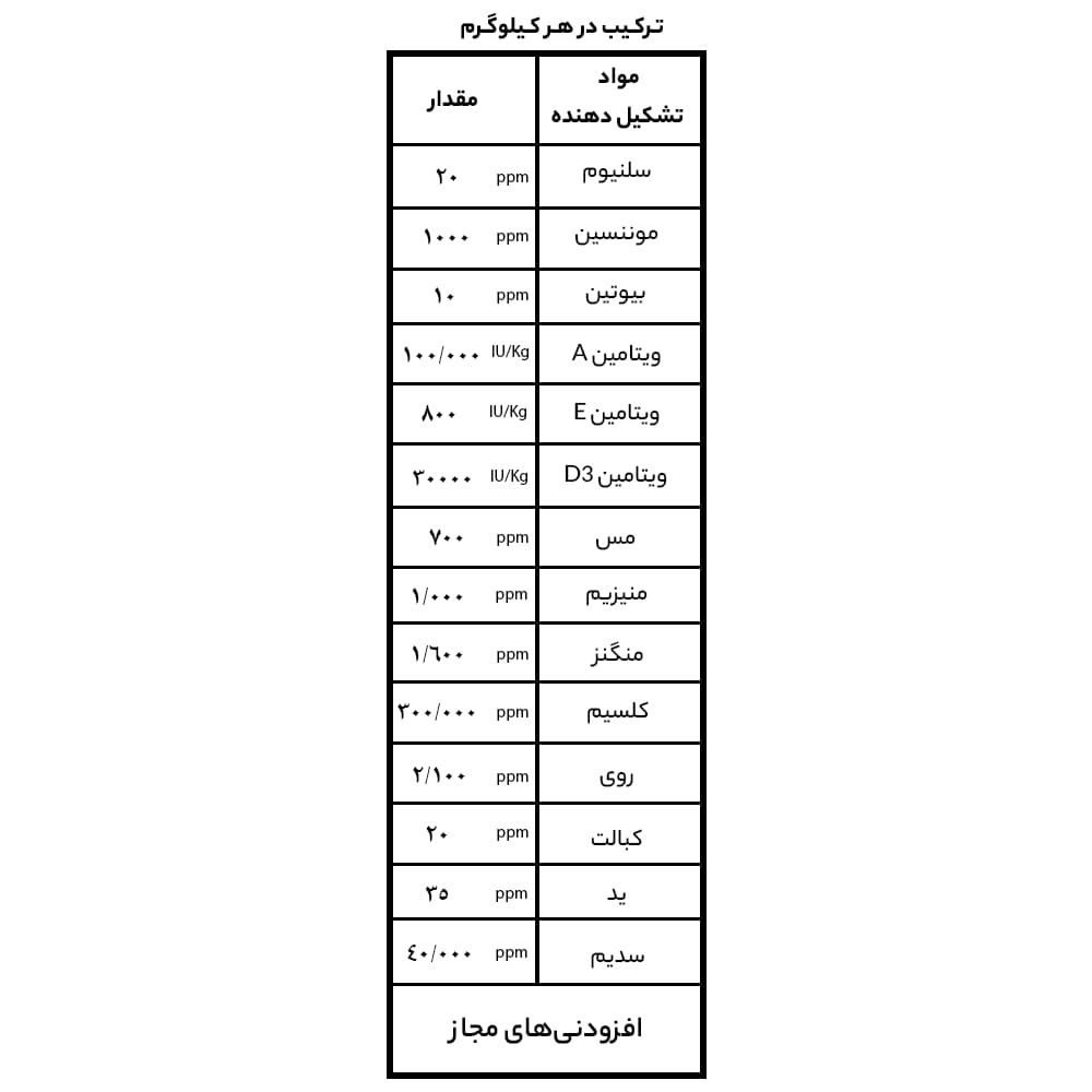 مقدار مصرف: در مجموعههای پرواربندی از سنین سهماهگی به بالا مصرف این مکمل به میزان دو درصد کنستانتره توصیه میگردد.